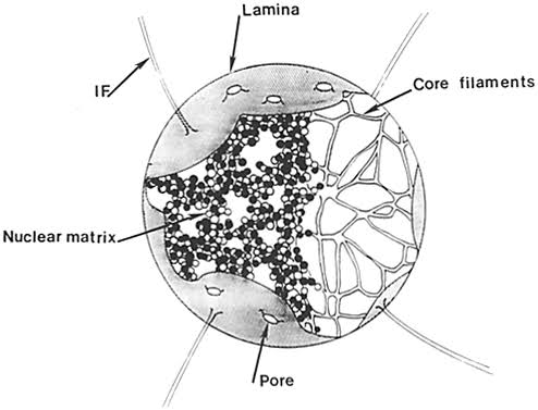 It is a network of fine fibrils of acid proteins that function as scaffold for chromatin.On the periphery ,below the nuclear envelope,nuclear matrix forms a dense fibrous layer Called nuclear lamina.Nuclear matrix consists of 2 types of intermediate filaments ,lamin A and laminB.